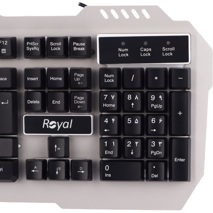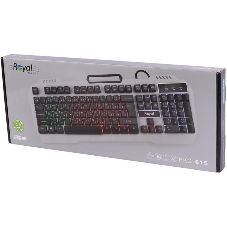 کیبورد گیمینگ RGB باسیم مدل RKG-615 دارای بدنه ای از جنس پلاستیک ABS و مقاوم در برابر ضربه ونفوذ مایعات می باشد و اتصال آن از طریق کابل 145 سانتی متری USB به درگاه کامپیوتر و لپتاپ صورت می گیرد. این کیبورد دارای کلید های فیزیکی بی صدا همراه با کلیدهای مولتی مدیا و کلید FN می باشد. این محصول مجهز به نشانگر LED بر روی بدنه خود جهت نمایش وضعیت کارکرد و پایه تنظیم ارتفاع است. از ویژگی های جذاب و پر طرفدار این کیبورد، قابلیت نورپردازی RGB آن است که این کیبورد را به یک محصول مناسب برای استفاده گیمینگ تبدیل میکند؛ همچنین این کیبورد دارای حروف فارسی بر روی کلید ها و قابلیت اتصال Plug and Play نیز بوده و با تمامی سیستم های ویندوز سازگار است.