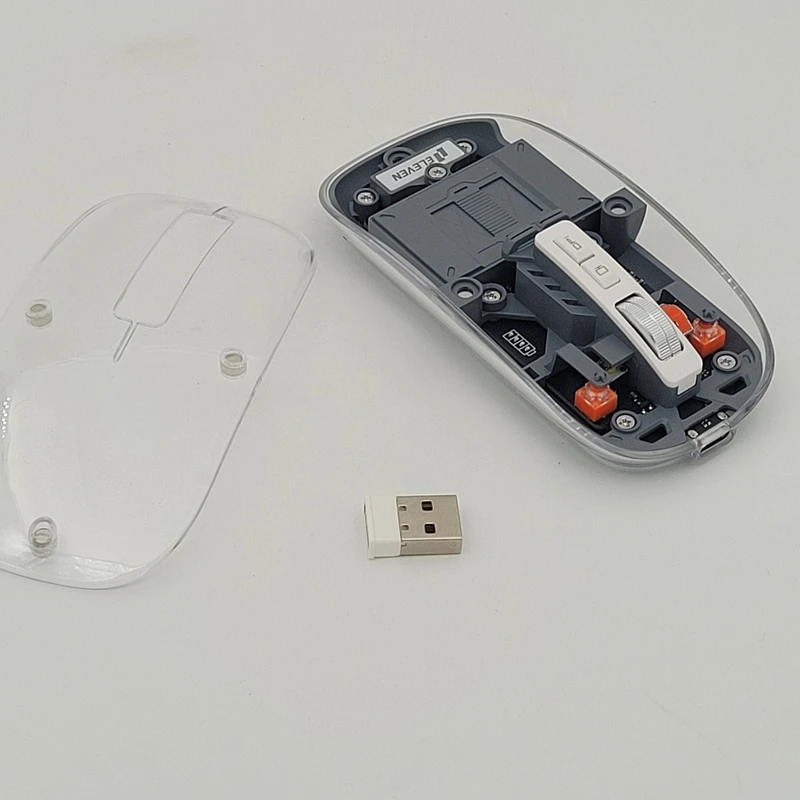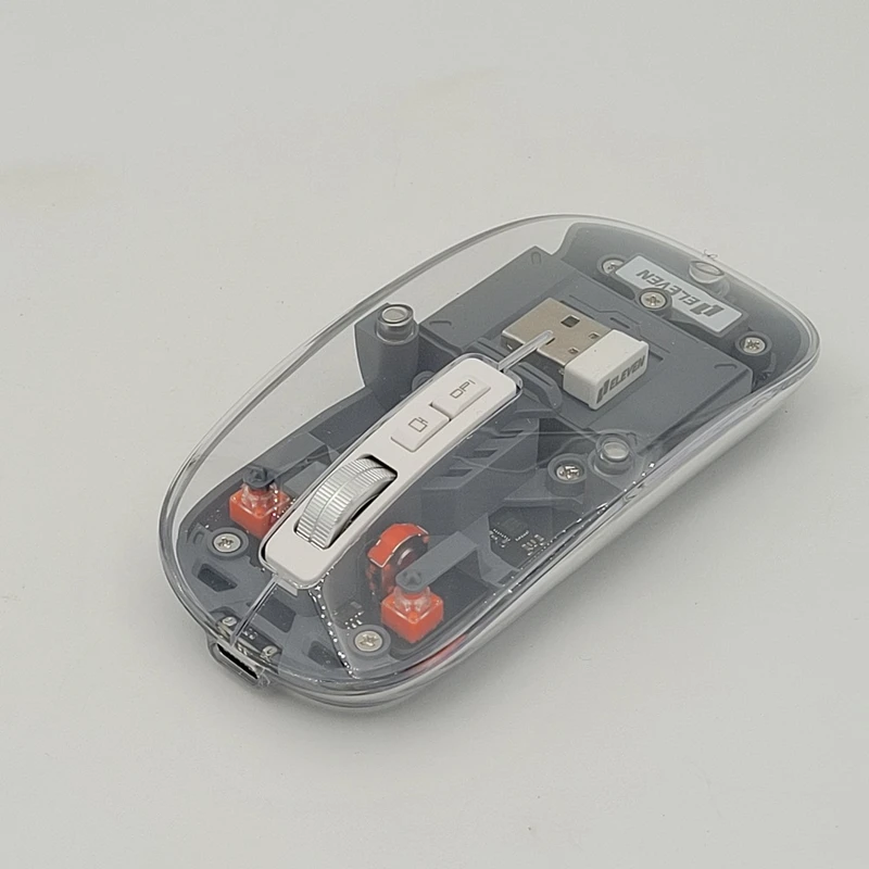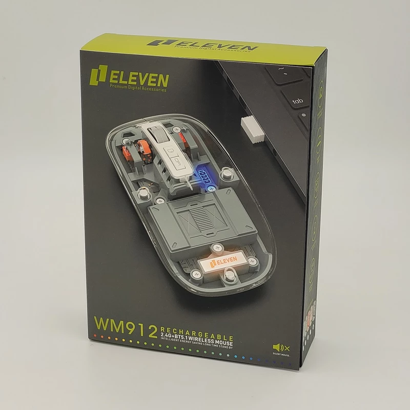 ماوس WM912 شرکت ایلون، یکی از جدیدترین ماوس های مطرح را روانه بازار کرده. این ماوس بیسیم شارژی میباشد و با پورت TYPE-C شارژ میشود. این ماوس قابلیت نمایش میزان شارژ را هم دارد. رویه این ماوس شیشه ایی هستش و داخل ماوس به زیبایی قابل دیدن هستش که به عنوان درب هم استفاده میشود و به صورت مگنتی وصل میشود تا عمر زیادی داشته باشد بعد از باز کردن آن شما میتوانید دانگل گیرنده را داخلش بگذارید تا خیالتان از گم شدن راحت باشد. این ماوس بیسیم شارژی قابلیت اتصال همزمان به یک دانگل و دو دستگاه بلوتوث را دارد که با کلیدی که زیرش هست میتوانید سوییچ کنید ، پنج کلید دارد که کلیک ها سایلنت هستند و دکمه دسکتاب دارد که زمانی که فشار میدهید تمام پنجره های روی صفحه پایین میرود. اسکرول این ماوس فلزی میباشد